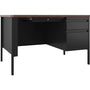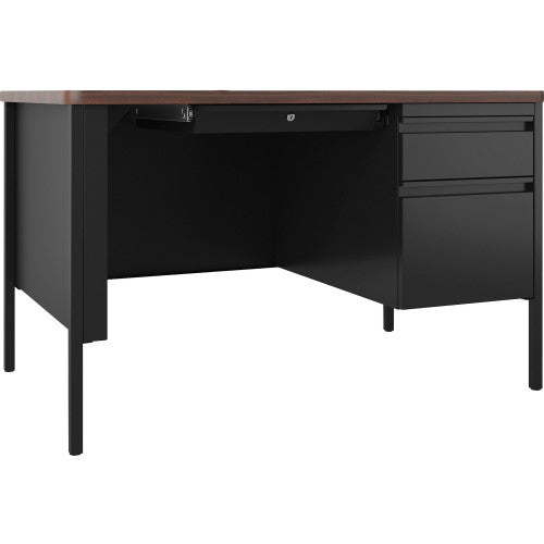 Single-pedestal desk belongs to the Lorell Fortress Series Teachers Desks that offer a practical and professional desk solution ideal for educational offices and classrooms. Durable, high-quality steel construction in black withstands rigorous daily use. The durable top features a T-mold edge to promote safety and high-performance, Classic Walnut laminate surface that is scratch-resistant, stain-resistant and water-resistant. Desk is also equipped a 3/4 modesty panel, locking center drawer and box/file pedestal on the right with full-extension, ball-bearing slides. Integrated drawer pulls are full-width. Central lock system locks all drawers. Steel construction and laminate top make the desk easy to clean and disinfect. Reinforced, double-frame inner structure keeps desk solid and sturdy for years of use. Steel desking meets or exceeds ANSI/BIFMA standards.