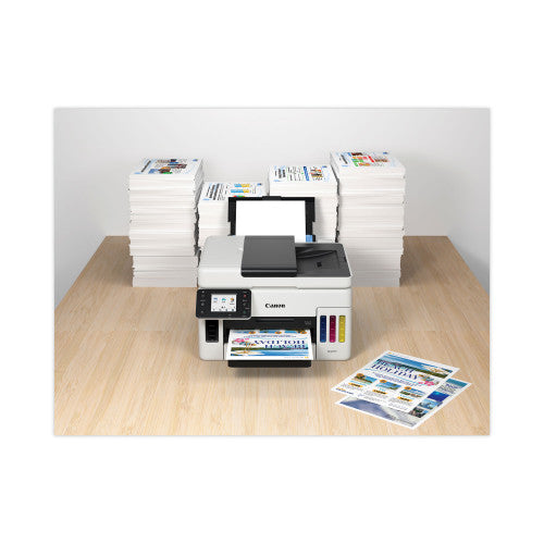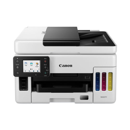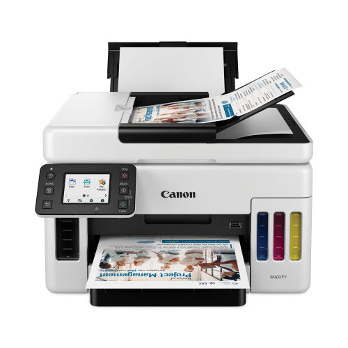 Designed to tackle any job, big or small. Print up to 47" in length. Presentations, images, reports, the MAXIFY GX6021 can deliver on anything you need. Print on envelopes and labels, on glossy or thick paper. Supports a wide variety of media types and sizes. Refillable ink tanks have keyed nozzles for each color, making refilling easy and error-free. Replaceable maintenance cartridges and printheads keep you up and running with no service visits required. Connect easily and quickly and set up Wi-Fi even without a computer. Work over Ethernet, Wi-Fi, or even straight from a USB stick. Print from your favorite mobile devices using the free Canon PRINT app. Machine Functions: Copy; Print; Scan; Printer Type: Inkjet; Maximum Print Speed (Black): 24 ppm; Maximum Print Speed (Color): 15.5 ipm. Features Easy-to-fill ink bottles have a "keyed nozzle" design to only fit and fill the correct color ink tank. Get running in just a few minutes thanks to a streamlined and easy setup process out of the box. Not only are the MAXIFY GX Series printers packed with features, they're also designed small to fit your workspace due to their small footprint. Get the job done easily with an intuitive and easy-to-use 2.7" LCD touchscreen.